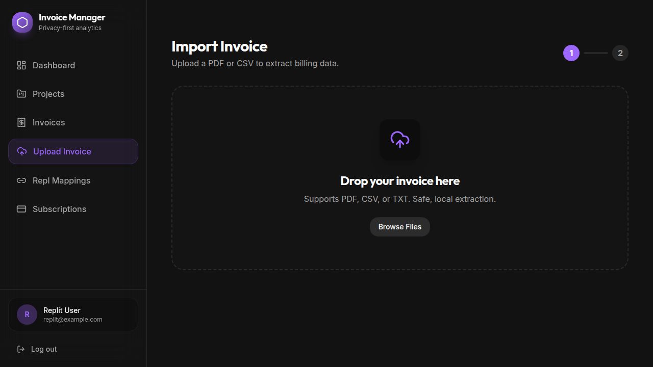 Prompt: I want you to generate a complete, privacy-first Replit web application that allows users to track, manage, and analyze Replit invoices for multiple projects. The application must have the following features:
