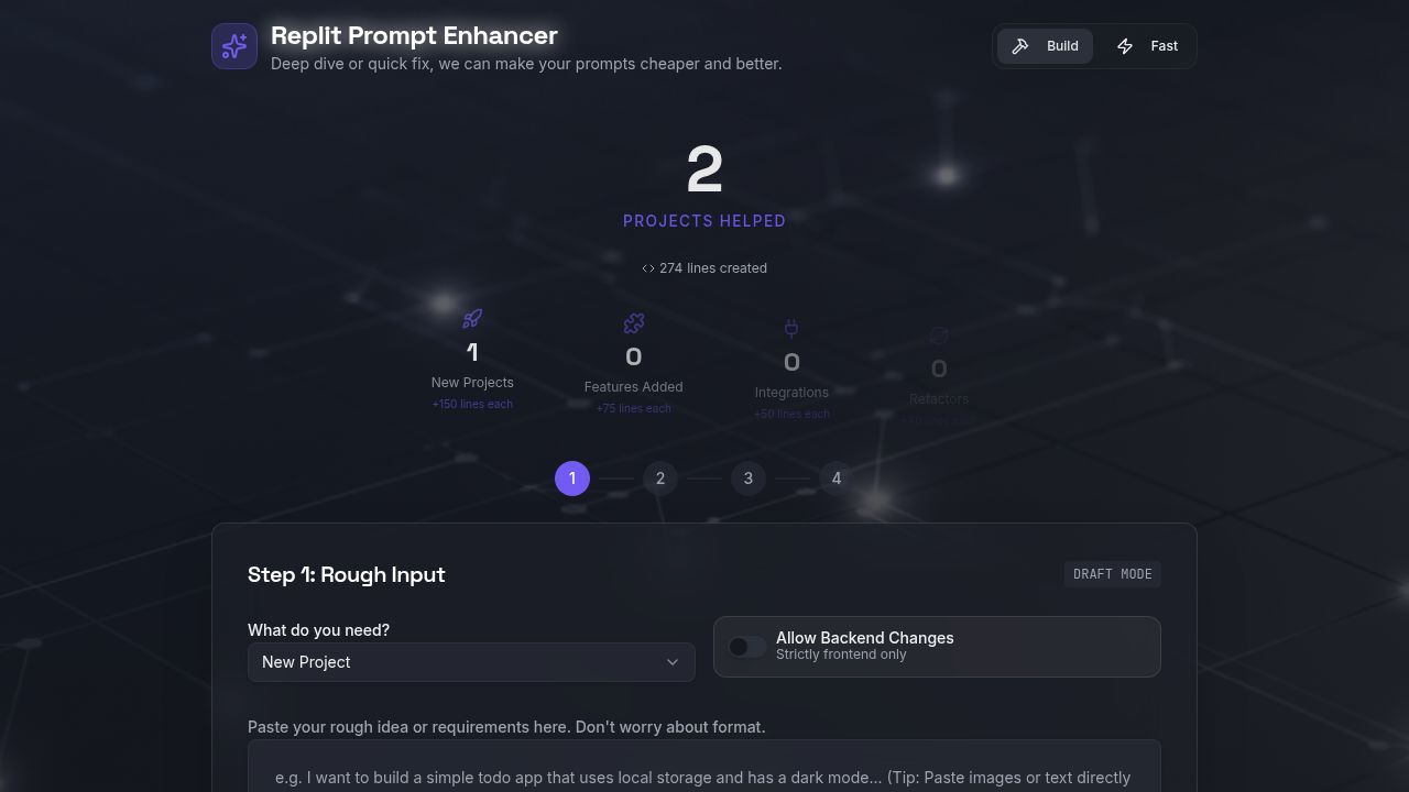 Build Mode – For complex projects: new apps, features, integrations, refactors. Full 4-step process with AI analysis.